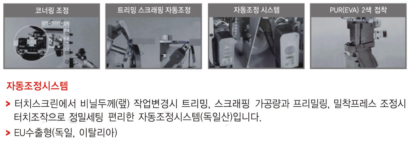 PUR, EVA 본드색상 분류 접착시 탈부착이 빠르고 간편하며(1분), PB칩 제거 기능과 작업종료시 자동잠금 개폐장치로 본드 누수가 없습니다. 또한 본드통 교체가 편리하여서 작업전환, 청소유지 관리등이 용이하며 예열시간이 빠릅니다. (15~20분)